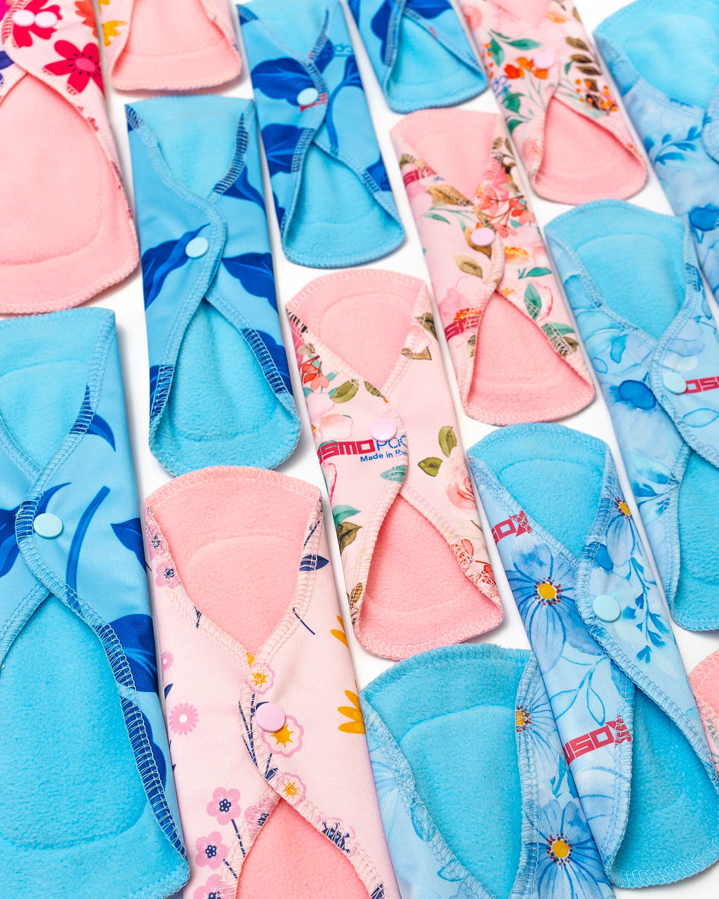 Reusable sanitary pad, 100% cloth, Made of 3 layers (fleece on the upper layer, zorb fabric/microfiber inside as absorbent, polyurethane laminate on the back layer) and polyresin snaps to hold it on the underwear. The KosmoPads package is a set of 5 reusable sanitary pads, plus 1 storage wet bag.